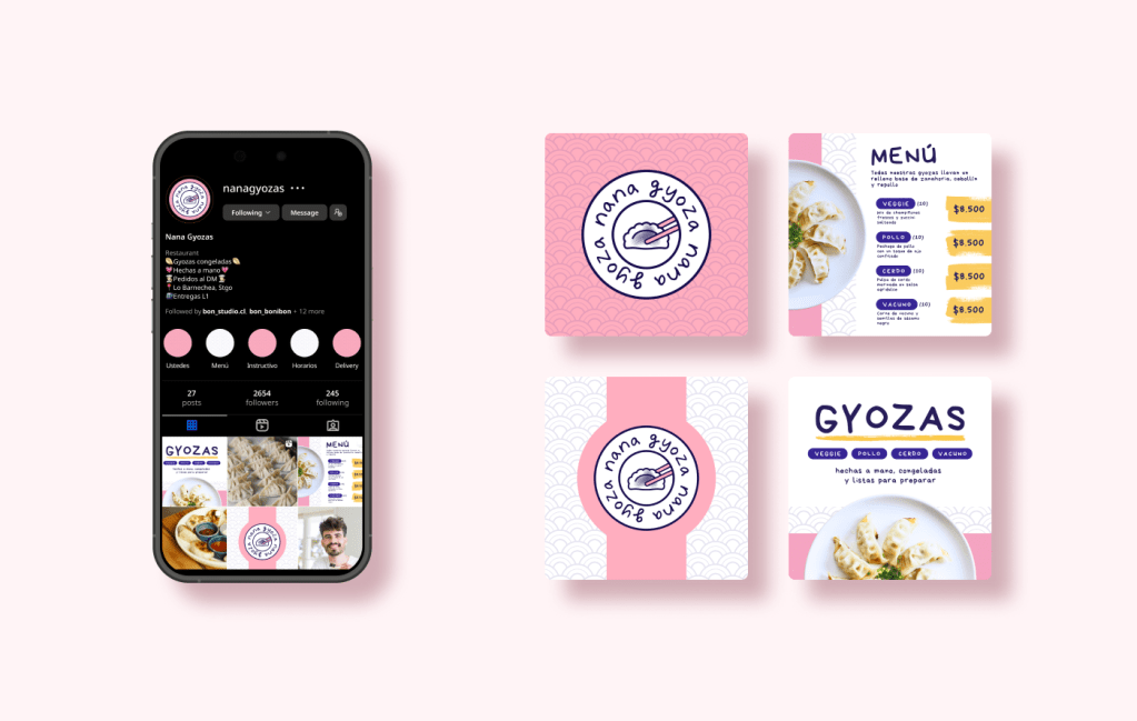 La tipografía, con trazos fluidos y un encanto orgánico, es una representación visual de las cualidades artesanales y caseras que caracterizan a Nana Gyoza.